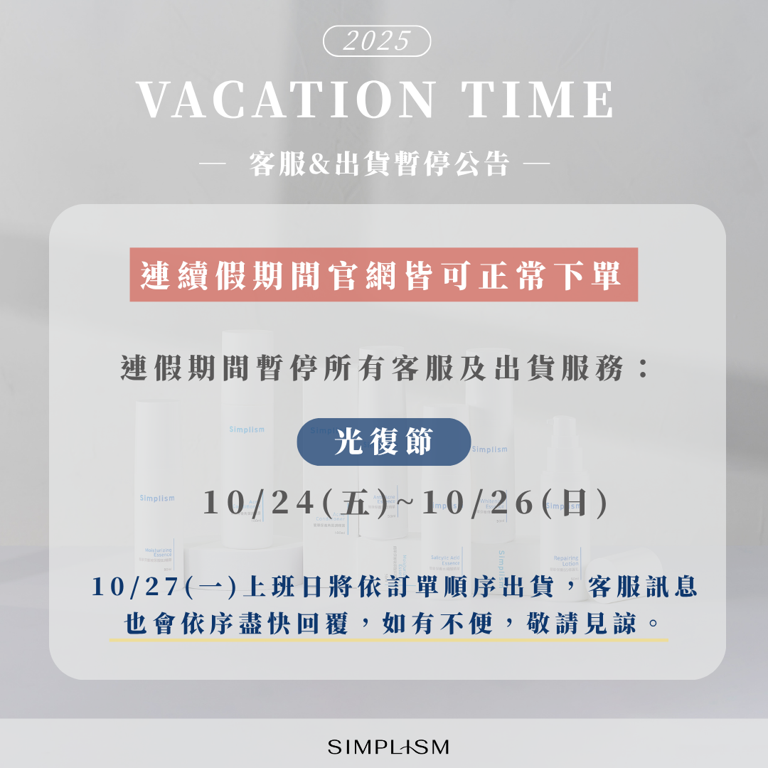 Simplism簡單保養不會以任何名義透過電話、簡訊或Email等方式核對購物資訊、銀行帳戶跟信用卡號等私人資訊,也不會以任何理由(例如:誤設分期付款或連續扣款、誤植訂單、補繳金額、會員升等、取消或變更付款方式等)要求您操作ATM或臨櫃、網路銀行匯款。若您接獲類似電話或簡訊,請立即掛斷並私訊官方FB粉絲團、官方LINE、IG,聯絡簡單保養客服中心,上班時間可撥打 (04)2512-1008 客服電話諮詢查證。