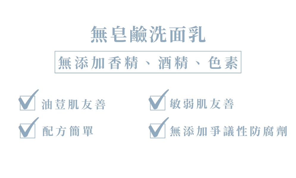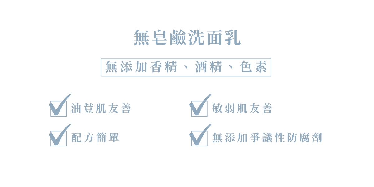 - 皂鹼是常見皂化型洗面乳當中的成分,雖然去脂力很好,但是很容易過度清潔,造成洗後肌膚乾澀。 無皂鹼洗面乳以溫和的胺基酸潔膚成分,取代皂鹼、SLS/SLES等刺激性較高的成分, 洗後膚感舒適,不會過於乾澀、緊繃。